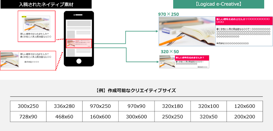 Logicad e-Creativeとは、入稿されたネイティブ素材を基に、サイズ違いのレイアウトに合うように無料でクリエイティブを作成し、広告配信できるサービスです。