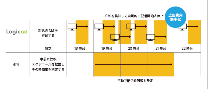 | 他社DSP | CM放送開始スケジュールを事前に入手することにより、広告配信・終了を事前に設定します。このため、事前にCM放映スケジュールが入手できない場合は、CM放映と広告配信のタイミングを合わせることができません。 |