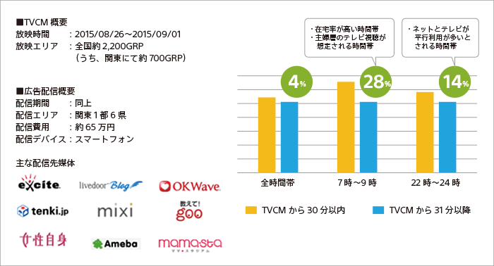 7時-9時では約30%増、22時-24時では約15%増と、テレビCMから30分以内のCTRが高い傾向を確認できました。