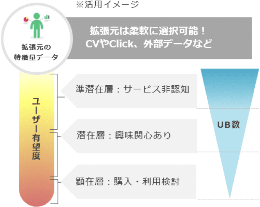 優秀なAIであるVALIS-Engineが、CVしたユーザーとCVしなかったユーザーの特徴を分析・比較することで類似ユーザーを導き出し、有望度の高い順に順位付けを行います。獲得状況に応じて有望度別にリーチが可能です。
