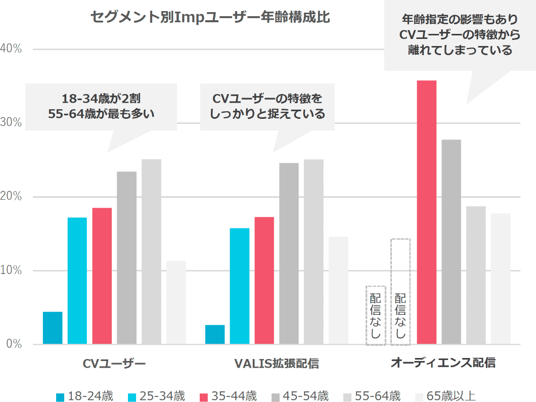 セグメント別の年齢構成比を比較すると、拡張配信がCVユーザー特徴をしっかり捉えていることが確認できる。