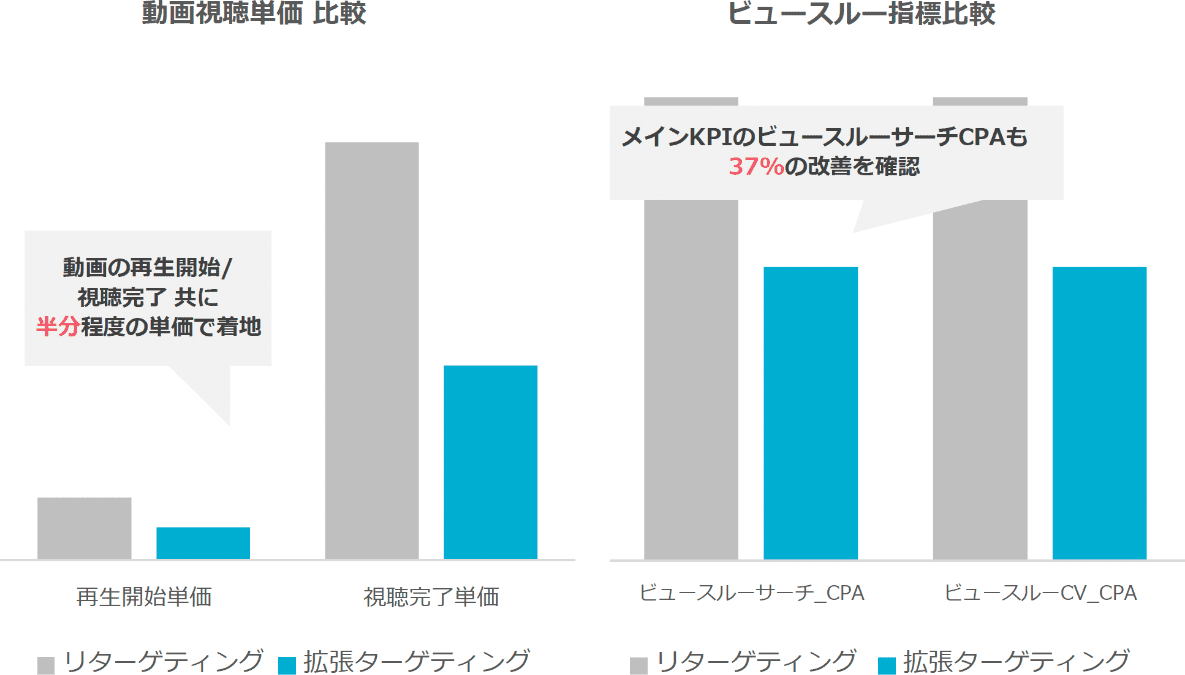 拡張配信追加により配信対象ユーザーが拡⼤したことで再⽣単価及び、視聴完了単価は⼤きく改善。合わせてメインKPIとなっていたビュースルーサーチCPAについても改善しており、VALIS拡張により有望度の⾼い潜在顧客に対して効率的にリーチできていることを確認。